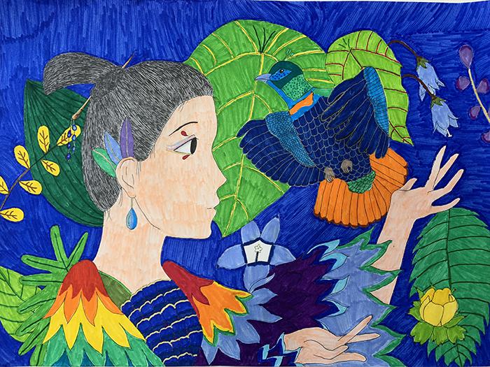 畫中描繪了色彩絢麗的棕尾虹雉,頭部為綠色,藍綠色羽冠,上體紫藍綠色,羽干細而裸出,羽端呈匙狀,如同絲絨一般,全身羽毛都閃耀著彩虹一樣的金屬光澤,又叫“彩虹鳥”和“九色鳥”。將絢麗多彩的“彩虹鳥”在心中、畫中擬人化,展開豐富的想象,以人物的形象將鳥擬人成人物,又將美麗的少女形象地比擬成“彩虹鳥”。她們低聲細語,輕聲呢喃。將心中對生命的愛,對動物、植物、綠色、美麗的家園、美好的愿景展示出來。反映了人與動物,人與自然,和諧共生,和諧共處,你中有我,我中有你,你就是我,我就是你。形成一幅絢麗多彩的畫面。展現(xiàn)出小作者對美好事物的憧憬,內(nèi)心的純凈與美好,體會到小作者內(nèi)心的溫暖與美好。