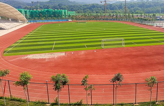 熱帶雨林的螞蟻也很熱情,剛進(jìn)場時,測量員在茂密的草叢穿梭找點(diǎn),晚上下班回來時能擦完一整瓶藥膏。后來,在20多臺機(jī)械和100多名管理人員及工人的奮戰(zhàn)下,茂密的草叢變成一條條明亮的道路。看,已經(jīng)到了運(yùn)動健兒們最喜歡的地方,國際運(yùn)動比賽水平的400米足球場,硅膠籃球場,為這個新建的校區(qū)增添了勃勃生機(jī)。