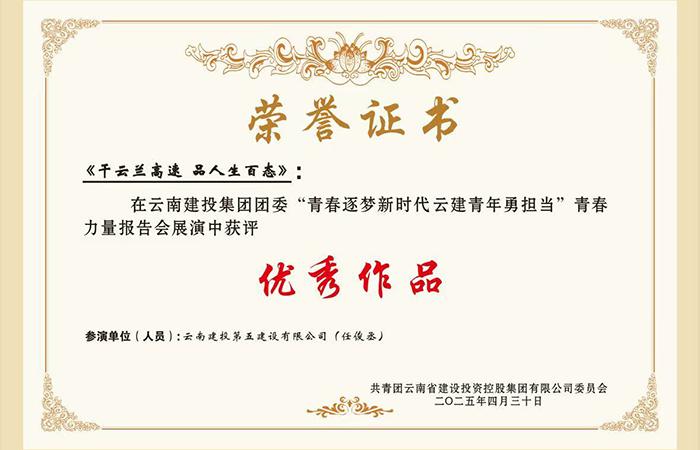 2025年五四青年節(jié),集團(tuán)舉辦“青春逐夢新時代 云建青年勇?lián)?dāng)”青春力量報告會。展演中,由公司團(tuán)委、市政路橋四部聯(lián)合編創(chuàng)的脫口秀《干云蘭高速,品人生百態(tài)》作品獲評“優(yōu)秀作品”。