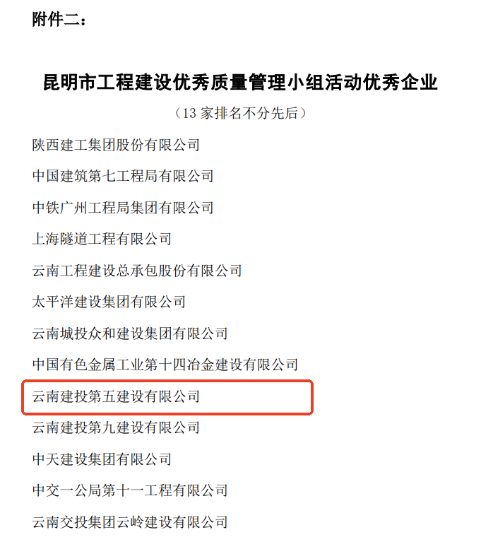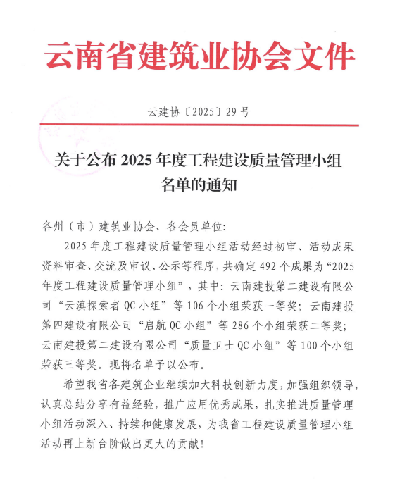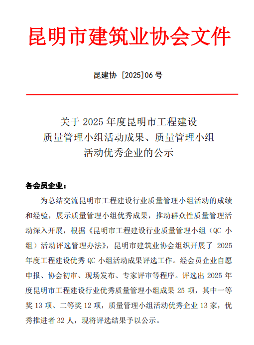 技術支持: 方森科技近日,云南省建筑業(yè)協(xié)會、昆明市建筑業(yè)協(xié)會相繼公布2025年度工程建設優(yōu)秀質量管理小組成果評選結果,公司共8項優(yōu)秀QC成果獲獎,其中云南省建筑業(yè)協(xié)會一等獎2項,二等獎1項,三等獎2項;昆明市建筑業(yè)協(xié)會一等獎1項,二等獎2項。公司獲評昆明市建筑業(yè)協(xié)會“工程建設優(yōu)秀質量管理小組活動優(yōu)秀企業(yè)”稱號。