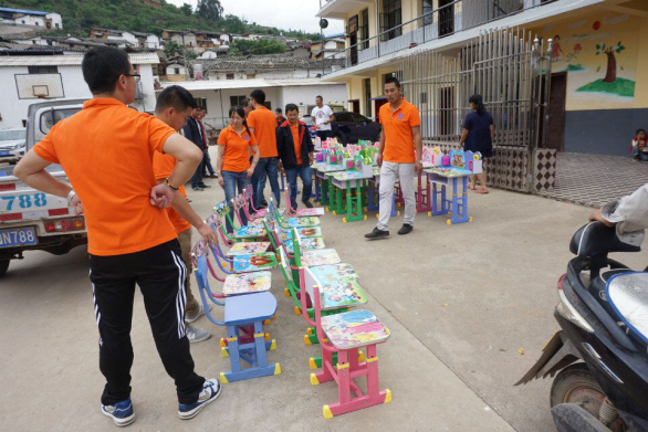 “我要米奇!我要熊二!我要……”在玉屏村幼兒園,孩子們看到五顏六色的小桌椅都禁不住七嘴八舌地開始挑選起自己喜愛的圖案。玉屏村小學(xué)里孩子們?cè)谛iL(zhǎng)組織下有序地從橙色衣服叔叔和阿姨手中的小蛋糕和學(xué)習(xí)用品,嘴里不停地說著“謝謝”,少先隊(duì)員們則不時(shí)地敬禮表示謝意。漢邑村小學(xué)孩子們用精彩的鼓樂表演來表達(dá)對(duì)彌玉高速象山試驗(yàn)段送來學(xué)習(xí)用品的謝意。最后一站曲陀關(guān)小學(xué),當(dāng)“橙色小分隊(duì)”載著滿滿一車的盆景到達(dá)時(shí),孩子們已經(jīng)穿著整齊的服裝在列隊(duì)歡迎,讓人感動(dòng)的是,車才停穩(wěn),高年級(jí)的同學(xué)們立即七手八腳的幫忙把盆栽搬下車,孩子們一聲聲的驚嘆聲以及臉上開心的神情讓大家感到無比的欣慰。
