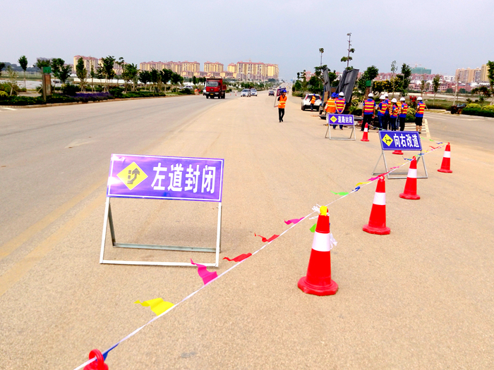 蒙自有軌電車建設(shè)項目蒙自上海路段(二工段)為雙向六車道,施工期間對部分車道進行分部圍擋,劃分行人、車輛與施工區(qū)域,確保過往行人與車輛的安全。項目部在施工路段前設(shè)立各類施工預(yù)告標志,用于通告道路的交通阻斷、繞行情況指示,在各平交路口段設(shè)置交通安全信號、警示、警告標志、標牌?,F(xiàn)場施工作業(yè)人員身著反光背心,佩戴安全帽,運輸車輛后部貼有醒目反光標志。