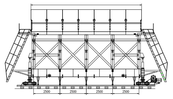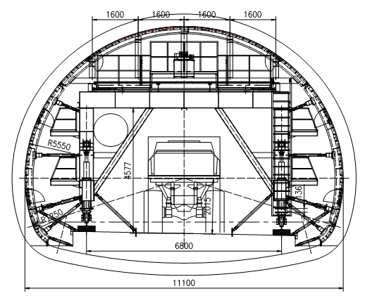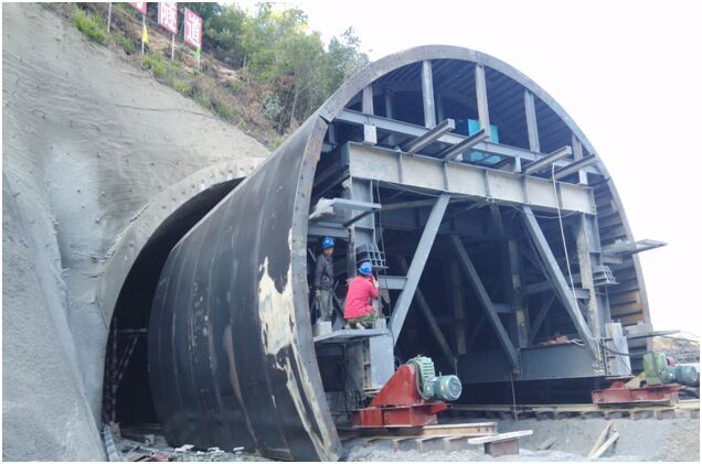 二襯臺(tái)車主要由模板總成、頂模架體、平移機(jī)構(gòu)總成、門架總成、主從行走機(jī)構(gòu)、絲杠千斤頂、液壓系統(tǒng)、電氣系統(tǒng)等組成。臺(tái)架采用裝載機(jī)和挖掘機(jī)配合安裝,模板安裝時(shí),主要使用挖掘機(jī)配合人工進(jìn)行安裝。二襯臺(tái)車用于對(duì)隧道內(nèi)壁的二襯砼襯砌施工,也是隧道施工過程二次襯砌中必須使用的專用設(shè)備。當(dāng)隧道掌子面(左右洞)施工達(dá)到80米后,在洞口處拼裝二襯臺(tái)車。