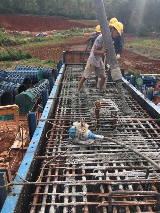 大木寨1號中橋單幅全長132.16米,橋面凈寬22米,為上跨改移地方路而設(shè),共有橋墩20個,蓋梁4個。此次順利澆筑完成的蓋梁為大木寨1號中橋右幅1#墩蓋梁。該蓋梁長度 11.2米,寬1.9米,高1.6 米,歷經(jīng)4個小時完成澆筑,澆筑C30混凝土 33立方米。項目部為了確保蓋梁首件工程的質(zhì)量,編制了詳細的施工方案,在原材料質(zhì)量控制的基礎(chǔ)上,對蓋梁施工全過程進行嚴格的管控。