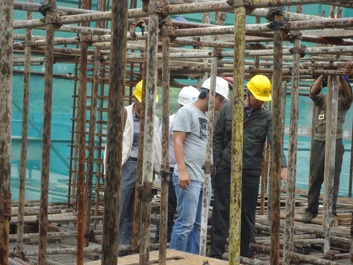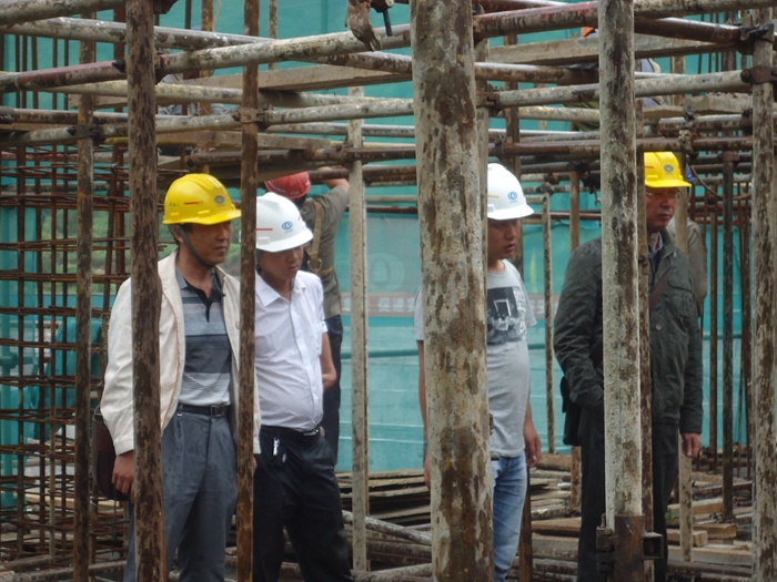 焦倫杰一行首先對生化膜池進行實地觀查,詳細了解膜池及設(shè)備區(qū)高支模的相關(guān)技術(shù)和操作細節(jié)后,指出施工現(xiàn)場存在的安全問題,并要求項目部及時進行整改,針對雨季施工面臨的問題給出了解決的意見和建議。