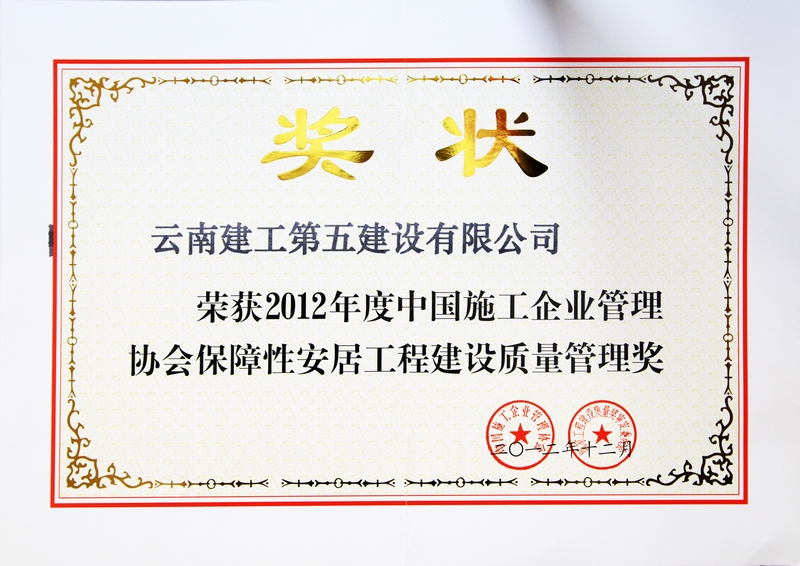 2012年12月,公司榮獲2012年度中國(guó)施工企業(yè)管理協(xié)會(huì)保障性安居工程建設(shè)質(zhì)量管理獎(jiǎng)。