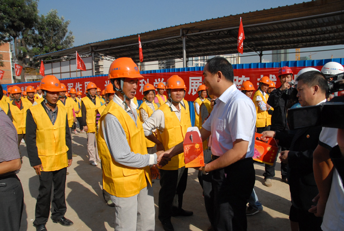 技術(shù)支持: 方森科技 2010年9月19日上午,在中秋節(jié)、國慶節(jié)來臨之際,昆明市總工會(huì)主席戚永宏率市總工會(huì)領(lǐng)導(dǎo)班子一行來到公司直五部施工的昆明市新工人文化宮建設(shè)工地慰問正在施工的公司職工和農(nóng)民工,為他們每人帶去了一盒月餅。戚永宏說:“大家辛苦了,祝大家節(jié)日快樂?!?BR> 五公司副總經(jīng)理李興奎代表施工單位對(duì)他們的到來和關(guān)心表示歡迎和感謝。他說:“多年來,公司創(chuàng)造了5項(xiàng)魯班獎(jiǎng),承建了省內(nèi)多項(xiàng)重點(diǎn)工程、市內(nèi)多項(xiàng)地標(biāo)性建筑。去年,公司簽訂工程合同額30億元,完成施工產(chǎn)值18億元,是各位領(lǐng)導(dǎo)關(guān)心、支持的結(jié)果。按建工集團(tuán)要求,今年公司承接任務(wù)要達(dá)到35億元,完成施工產(chǎn)值25億元,公司將不斷強(qiáng)化質(zhì)量、安全、文明施工管理,參與昆明市“四創(chuàng)兩爭”活動(dòng),支持新昆明的建設(shè),為昆明市的經(jīng)濟(jì)發(fā)展作出應(yīng)有的貢獻(xiàn)?!睂?duì)于昆明市新工人文化宮項(xiàng)目,他強(qiáng)調(diào)“公司將與設(shè)計(jì)、監(jiān)理各單位密切配合,盡快掀起施工熱潮,嚴(yán)格管理,精心施工,重合同,講誠信,按期完成施工任務(wù)。”