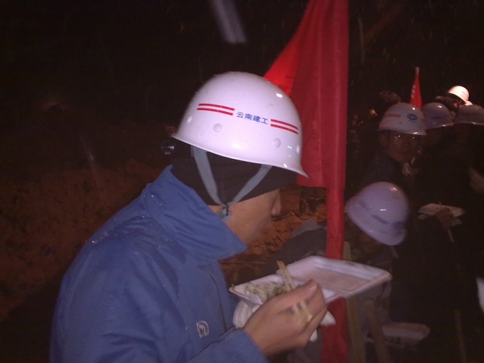 天色逐漸暗了下來(lái),氣溫也逐漸在下降,雖然參加救援的人好幾個(gè)小時(shí)沒喝一口水、沒吃一點(diǎn)東西,但仍然沒人放棄。晚上十點(diǎn),大家在奮戰(zhàn)了近十個(gè)小時(shí)后才匆匆忙忙吃了一盒盒飯。晚上十一點(diǎn),項(xiàng)目部參加救援的人員在總指揮的安排下,一部分撤離了救援現(xiàn)場(chǎng),項(xiàng)目部的趙登旭則留在了一線與救援人員繼續(xù)奮戰(zhàn),直至1月12日的中午。